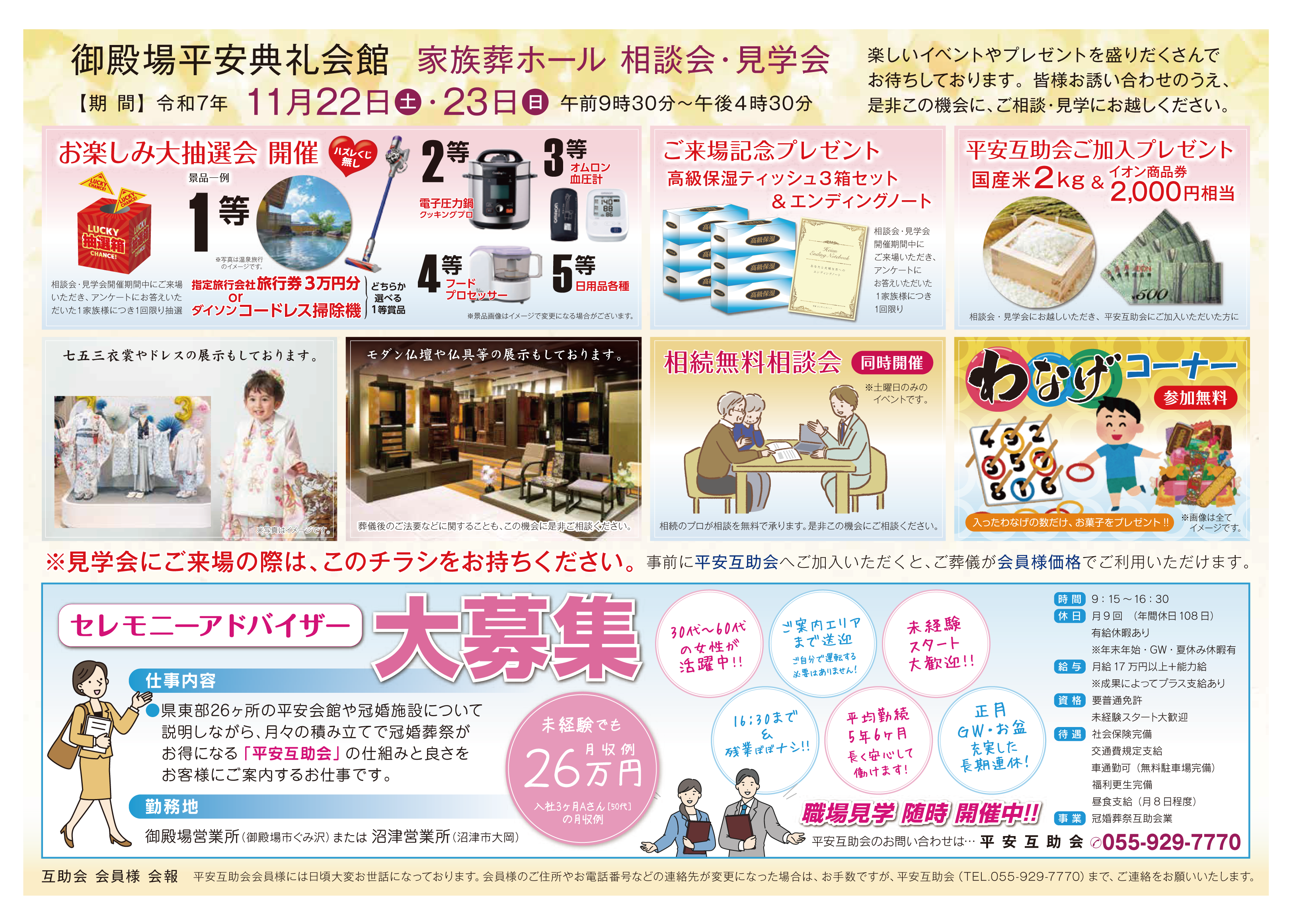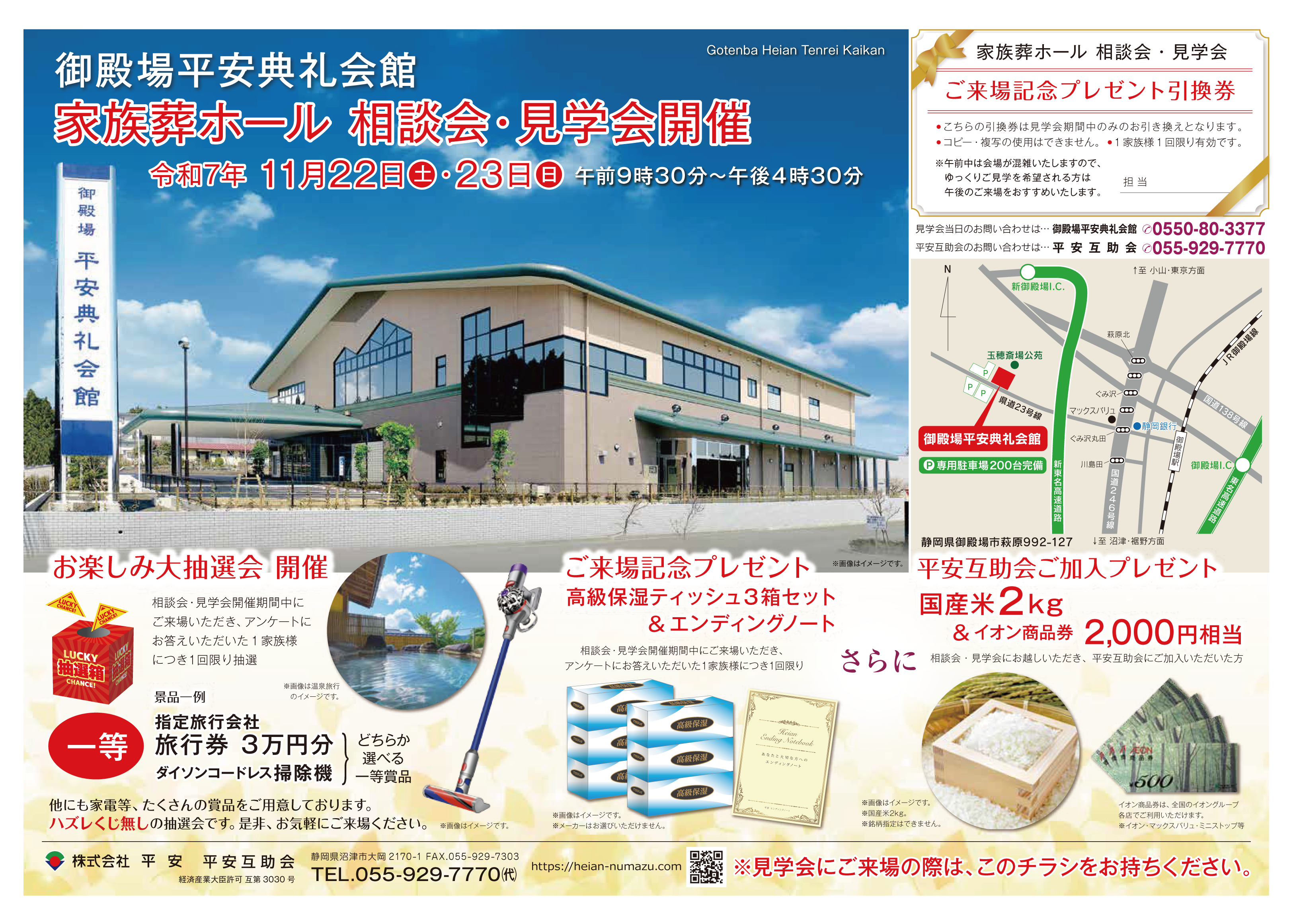 令和7年11月22日(土)23日(日)の2日間、御殿場平安典礼会館にて、家族葬ホール見学会・相談会を開催いたします。互助会やご葬儀の相談はもちろん、式場の見学も可能です。