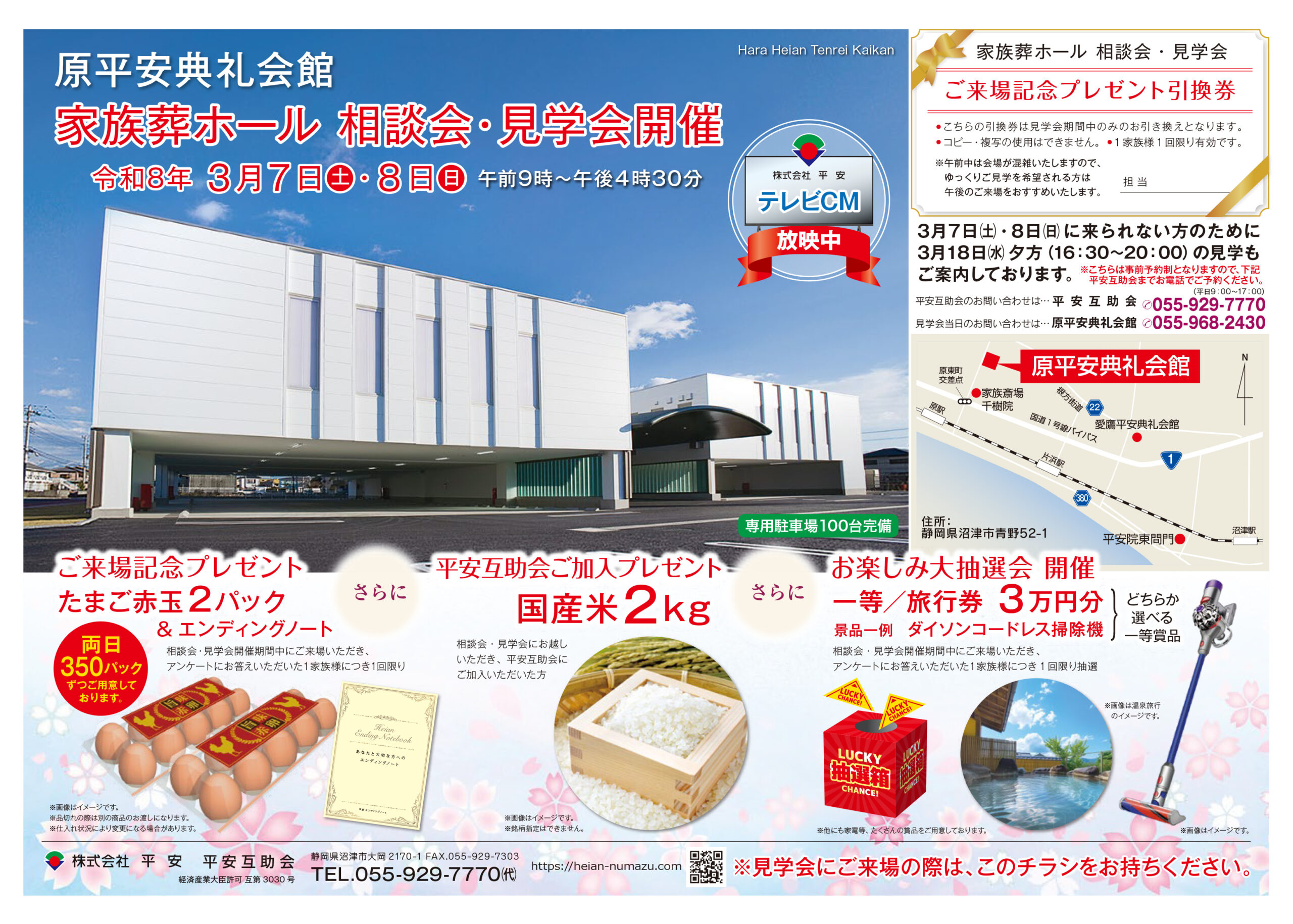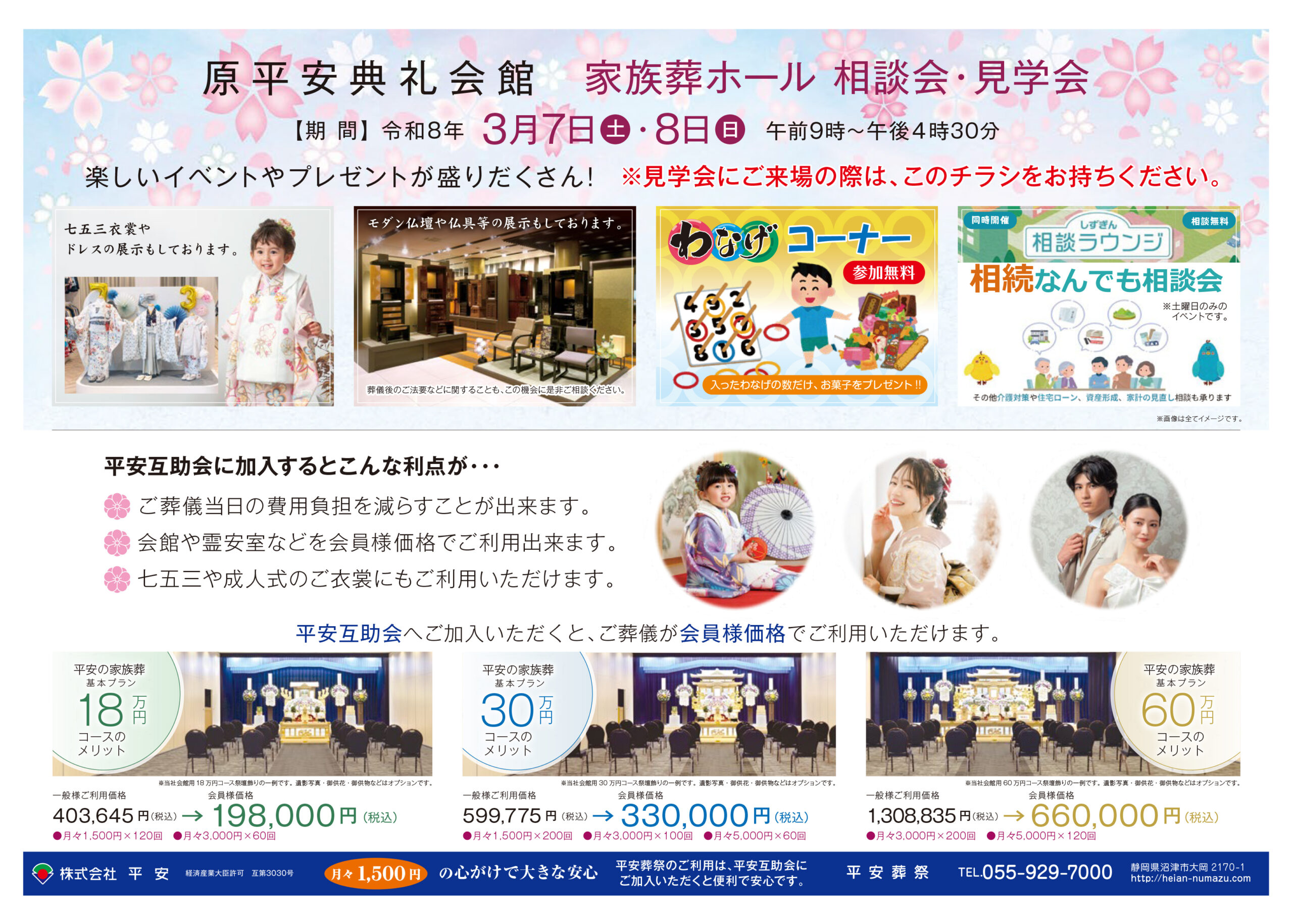 令和8年3月7日(土)8日(日)の2日間、原平安典礼会館にて、家族葬ホール見学会・相談会を開催いたします。互助会やご葬儀の相談はもちろん、式場の見学も可能です。